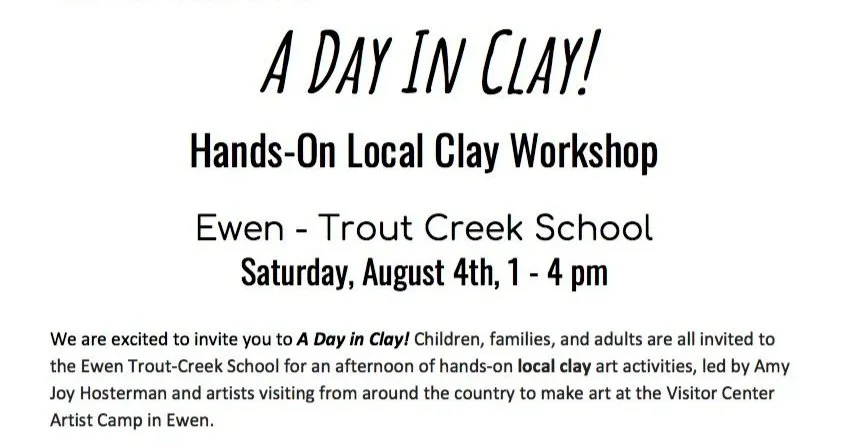 STAY In Clay will run August 1st - August 8th, 2020, in partnership with the Ewen Trout-Creek School in Ewen, MI. We will be distributing FREE do-it-yourself kits to Make-Your-Own-Mug at home, using Ewen’s local clay, harvested and prepared by our artists at the Visitor Center Artist Camp.